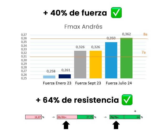Abajo te muestro resultados a lo largo de los diferentes test, pero su historia es espectacular por lo siguiente: Andrés no es un superdotado de la escalada, no tiene un “don innato”. Es una persona normal, que le encanta la escalada y que ha conseguido todo gracias a su esfuerzo y a entrenar adecuadamente.