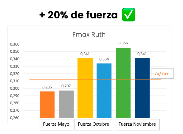 Tras ver el test vimos que tenía que mejorar su fuerza máxima para conseguir progresar. Tras varios meses hemos conseguido los objetivos: encadenado vías mucho más físicas y varios proyectos de 7a que no había podido encadenar previamente