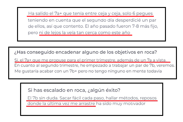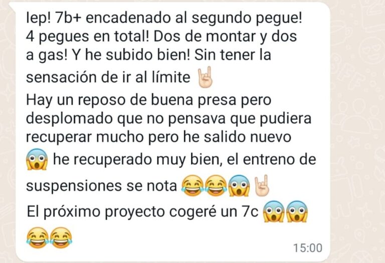 Gracias a mejorar sus puntos débiles y realizar un entrenamiento en roca mejoró su táctica y consiguió encadenar 7b+ en 6 semanas. Sus palabras: